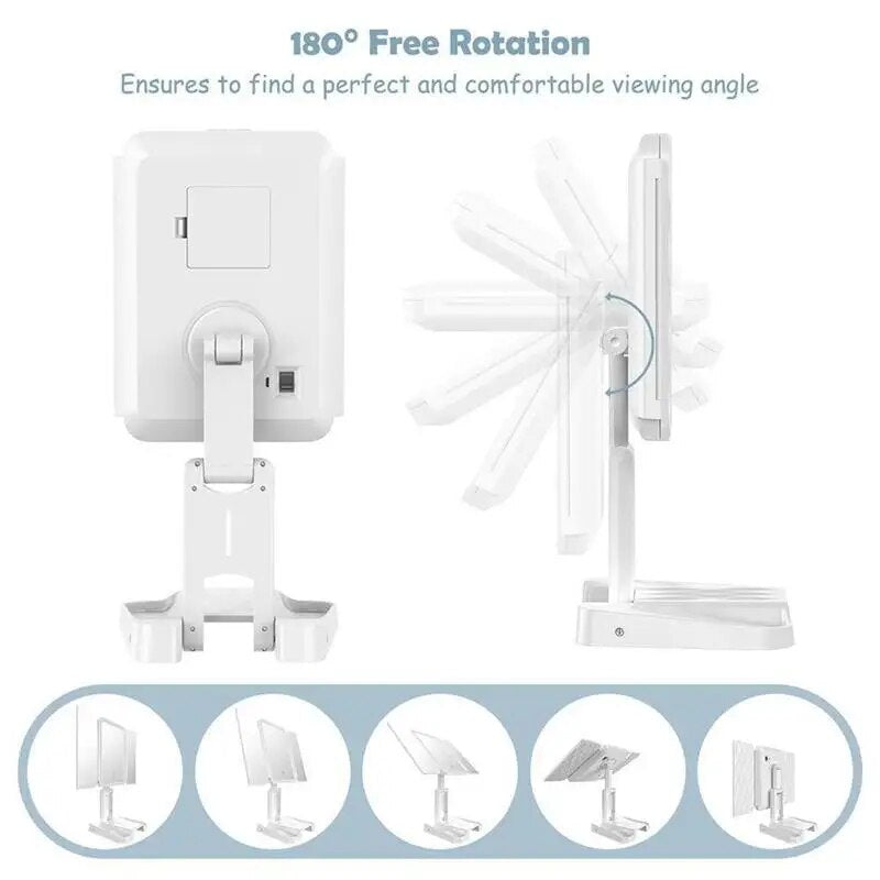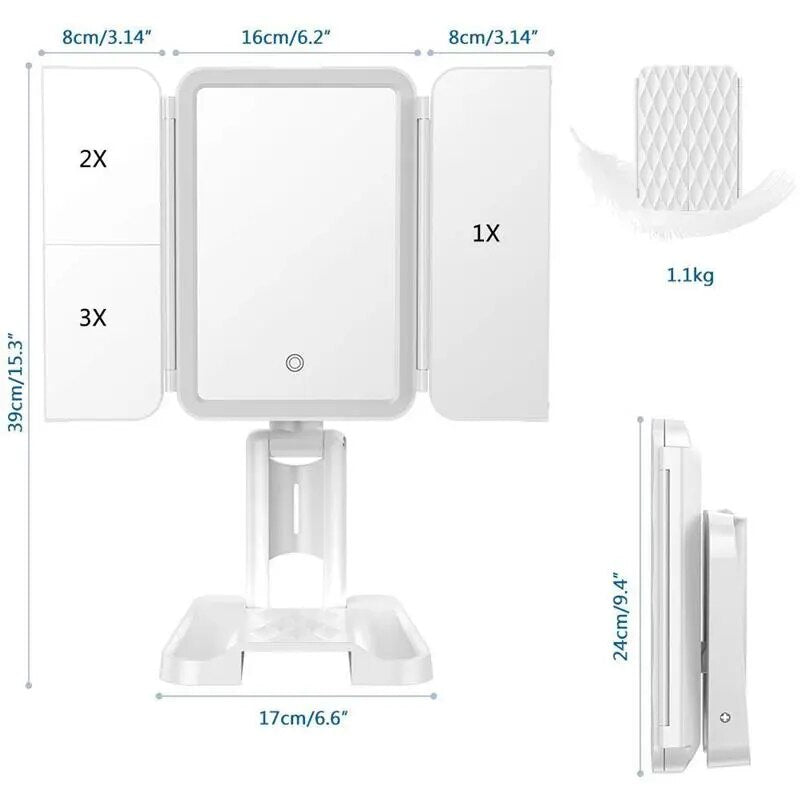 Keep your beauty game strong with this practical and durable plastic vanity mirror! Crafted from high-quality plastic, this mirror is equipped with built-in LED lights for optimal illumination. The three-panel design allows for a wide-angle view, providing a comprehensive and distortion-free reflection of your face. Suitable for travel or for use at home.